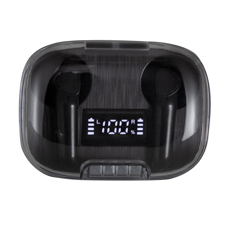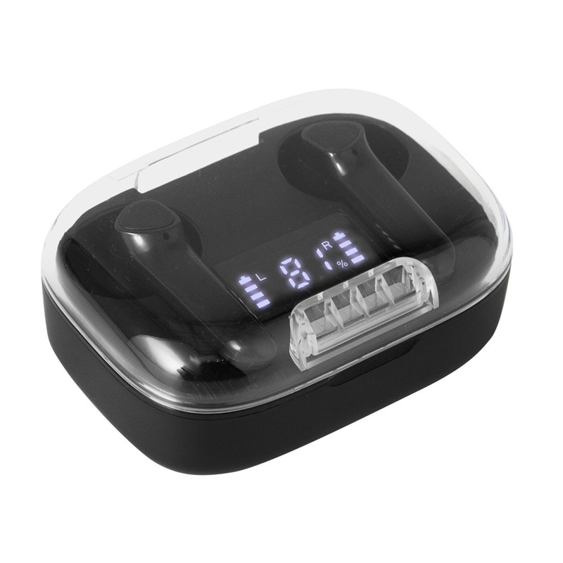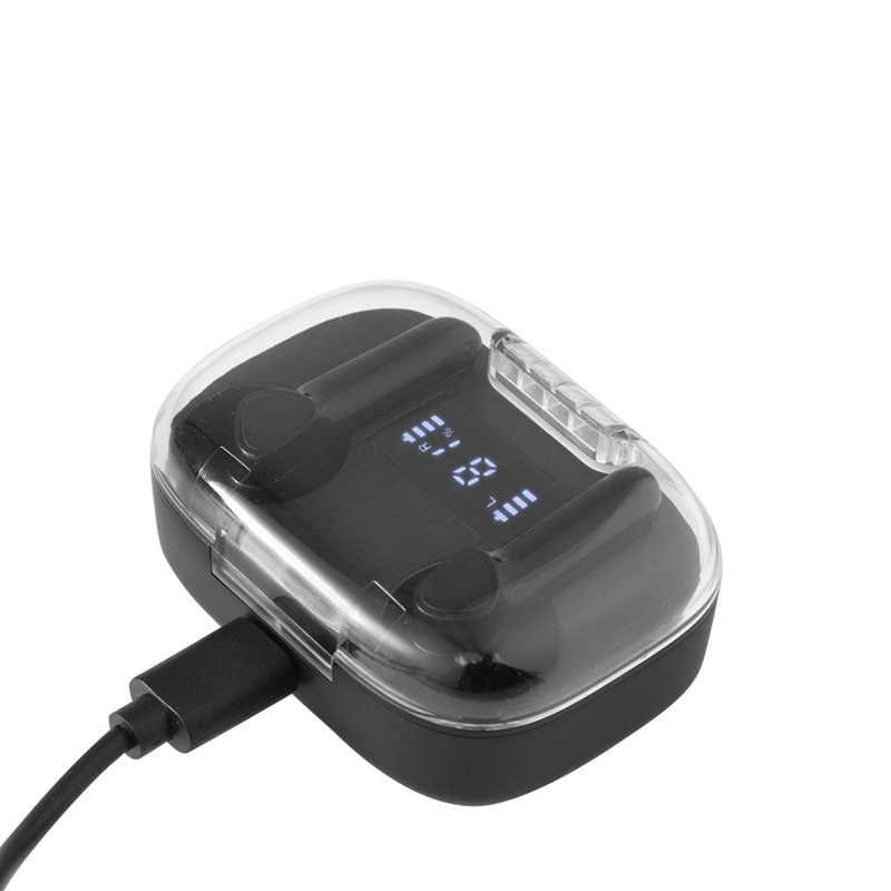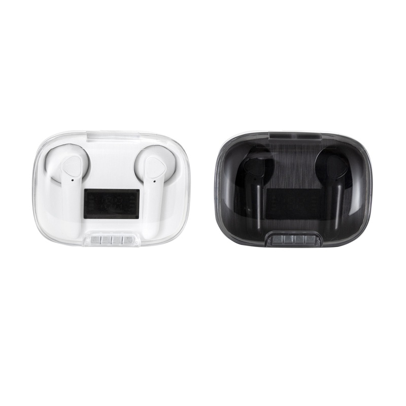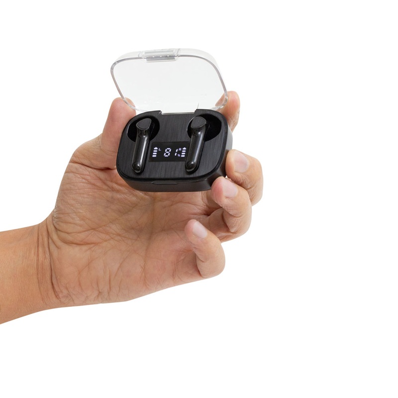 Auriculares Bluethooth versión 5.0. Capacidad Batería: 30 mAh para cada auricular. Capacidad Batería caja de carga: 300 mAh. Pantalla digital y tapa transparente. Rango de alcance: 15 metros. Tiempo de reproducción: aprox. 3 horas. Tiempo de Carga: 1 hora Duración de la carga en inactividad: 200 horas. Cable de carga USB tipo C en color blanco para auriculares blancos. Presentación en caja de regalo blanco mate para auriculares blancos. Plastico ABS. Medidas: 6X4,5X2,5cm. Incluye aplicación de logo.