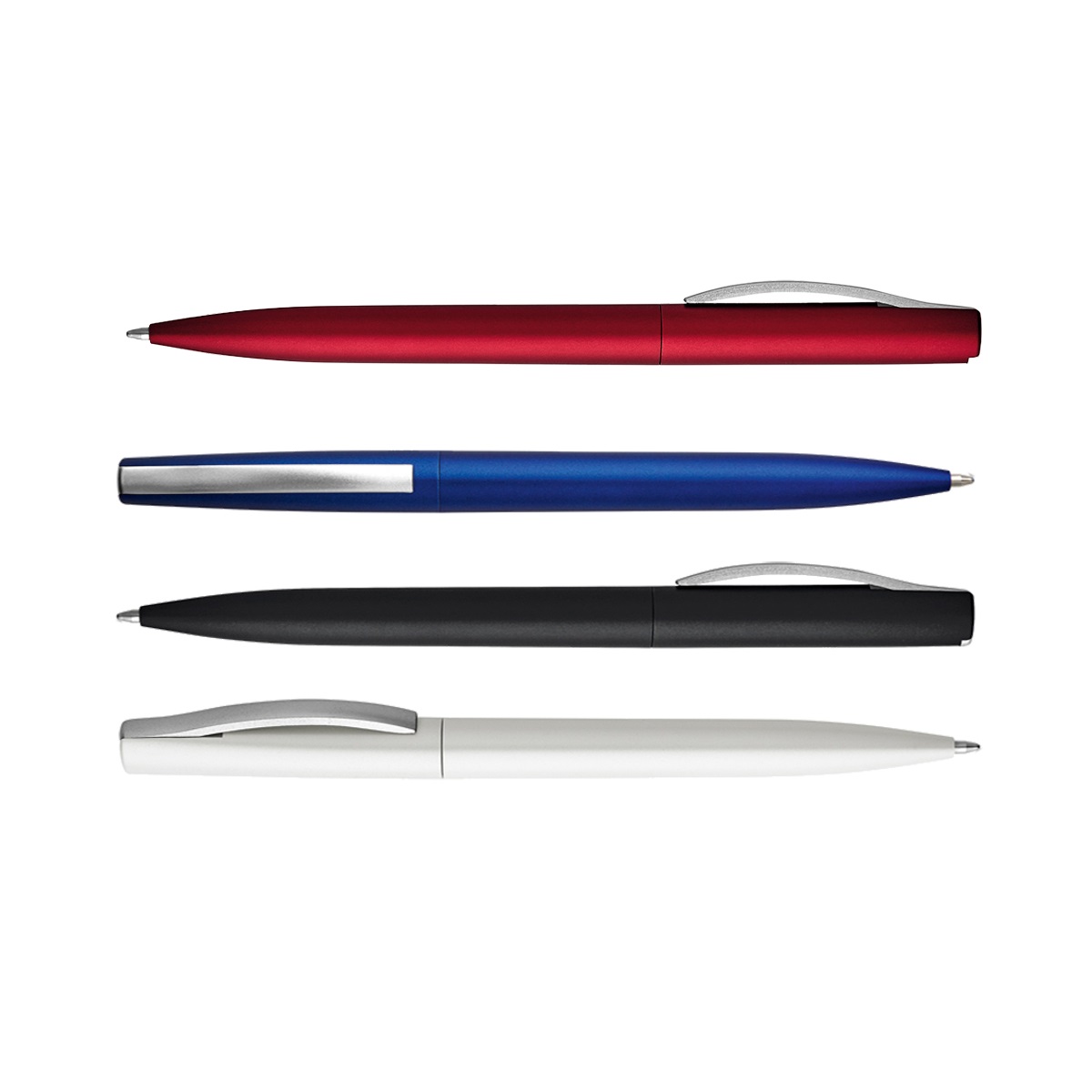 Clip y cuerpo con acabados metalizados. Fabricado en ABS con mecanismo de giro. Tinta negra. Medidas: ø1.1×1.46cm. Colores: negro, blanco, azul, rojo. Incluye aplicacion de logo.