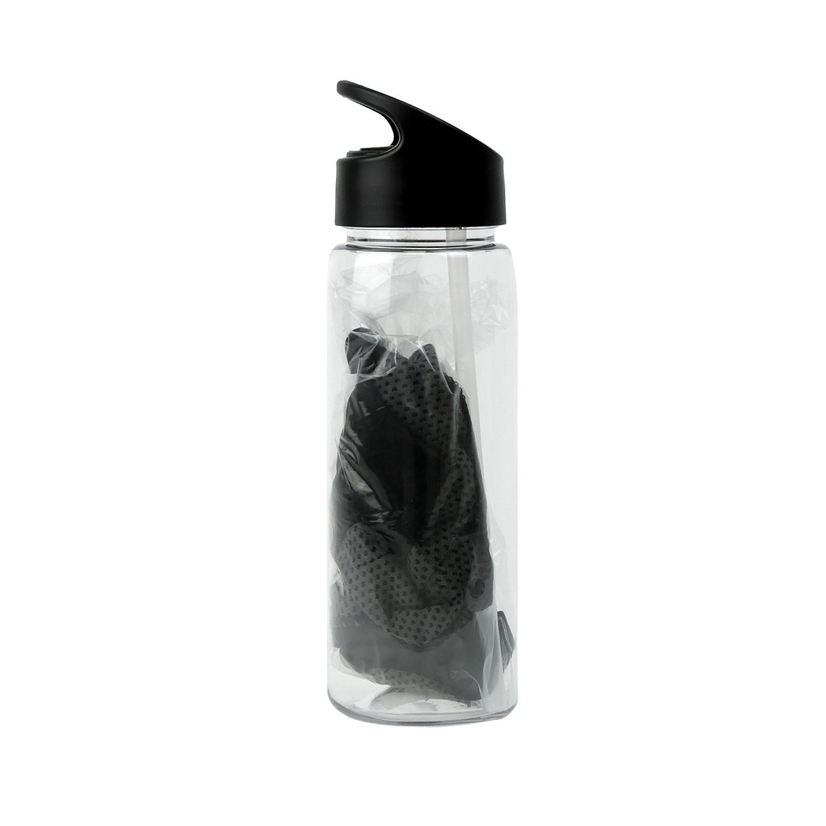 Botella deportiva + toalla de poliéster. Fabricada en RPET, diseño ergonómico. Tapa de polipropileno con sorbete y anillo para mejor agarre. Capacidad: 800ml. Medidas: Ø7.7×25.3cm. Incluye aplicación de logo.