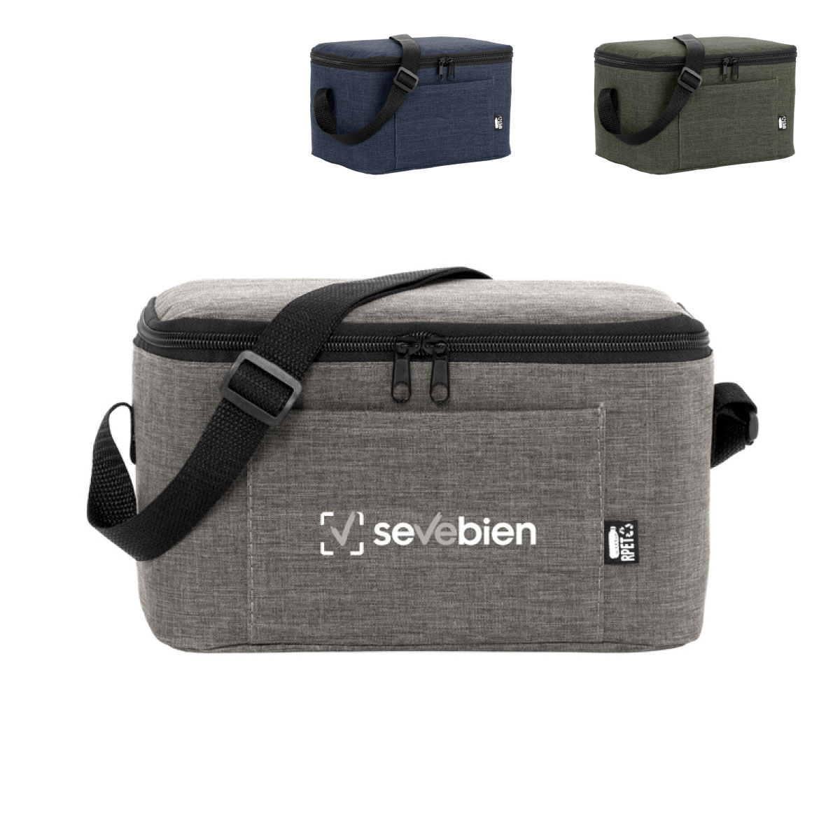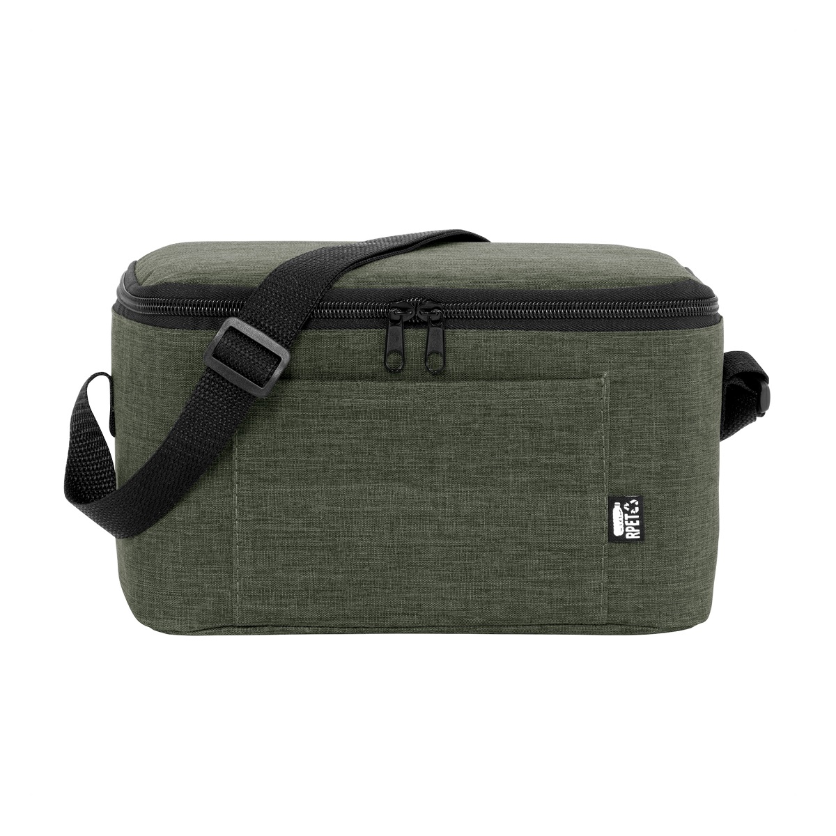 Cierre superior bidireccional. Correa regulable con hebillas plásticas. Bolsillo frontal. Capacidad ideal para transportar hasta 6 latas. Materiales: Exterior de poliéster 300D recubierto de RPET. Interior de espuma de polietileno recubierto de PEVA. Medidas: 26x16x14cm. Capacidad: 6Lts. Incluye aplicación de logo.