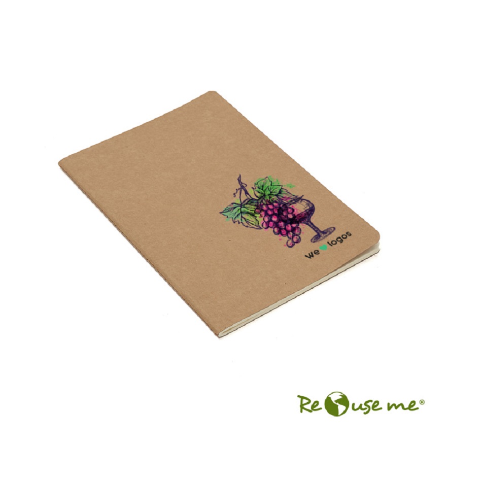 Cuaderno A5 de 40 hojas lisas de 70gr con tapa blanda fabricada en cartón duro. Encuadernación cosida. Medidas: 21 x14 cm (Altura x Ancho). El producto viene en una bolsa de PLA 100% compostable. ReUseMe.. Incluye aplicación de logo.