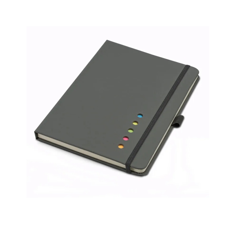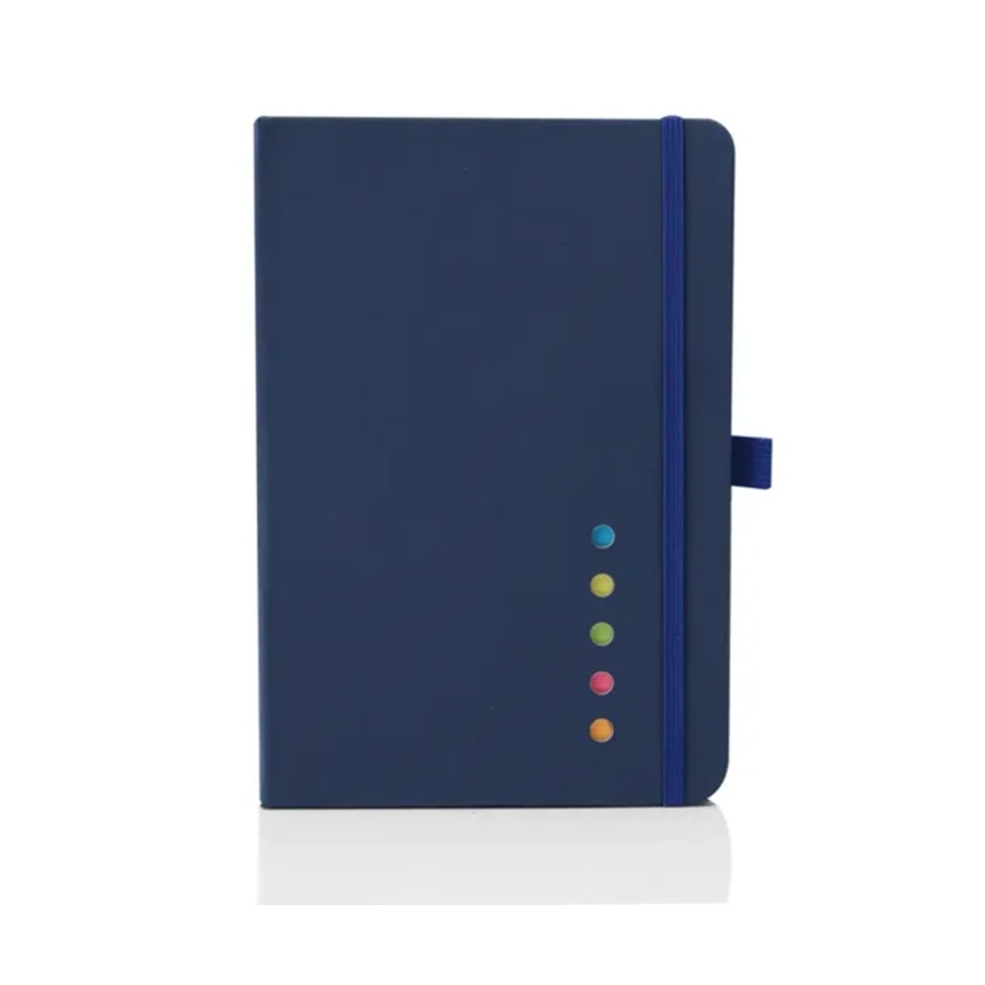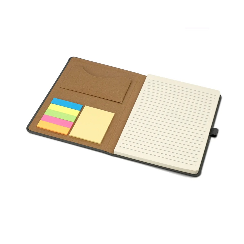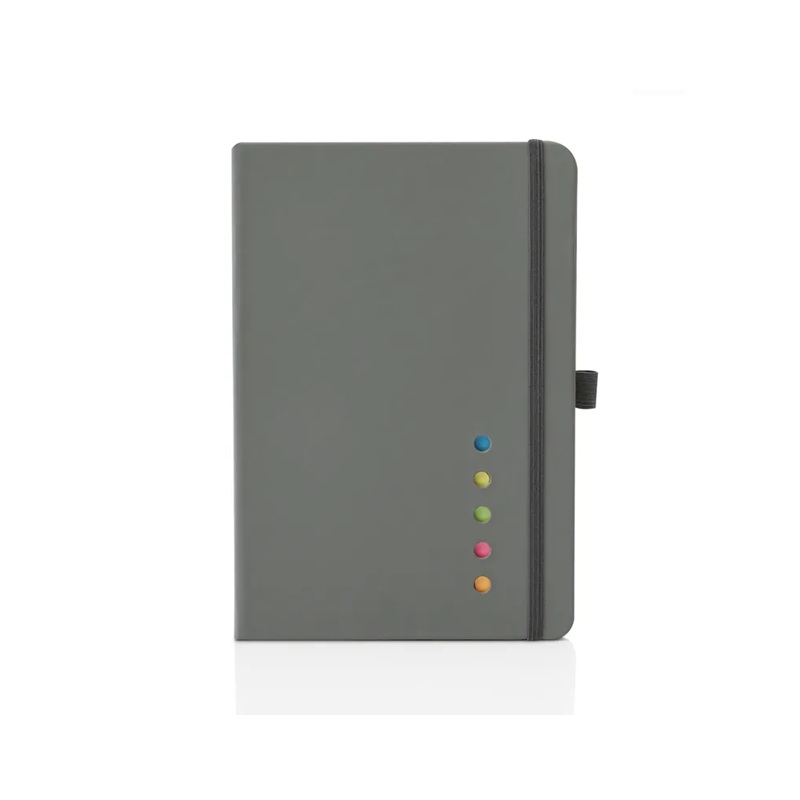 Cuaderno forrado en eco cuero soft mate. Con banda elástica de sujeción al tono y presilla porta bolígrafo de 15mm. 80 hojas rayadas de papel crema de 70gr. y señalador. Con 25 hojas autoadhesivas y banderas + sobre porta tarjetas en retiración de portada. Medidas cerrado: 21×14,6cm. Incluye aplicación de logo.