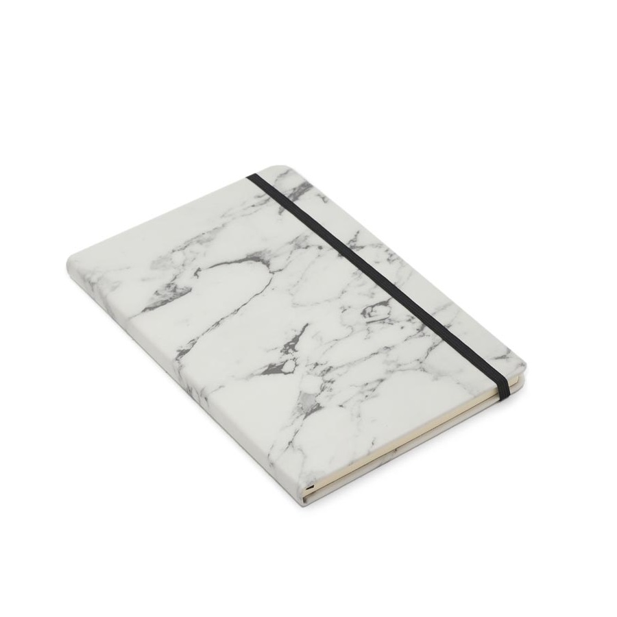Cuaderno A5 con hojas lisas de 70gr de tapa dura de PU con estampa simil mármol. Cuenta con cierre elástico y marcador de páginas color negro. Encuadernación cosida. Medidas: 21 x 1,4 x 14 cm (Altura x Longitud x Diámetro). El producto viene presentado en una bolsa de PLA 100% compostable.