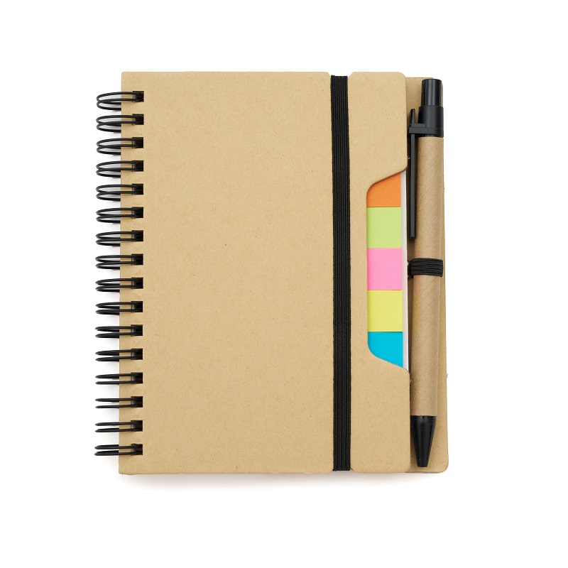 Cuaderno practico anillado, con regla, notas adhesivas y birome. Cuenta con una lapicera, 5 colores de notas adhesivas, 25 unidades de cada una, y una regla de plástico. Todos portables dentro del mismo cuaderno. Medida: 14.5x2x12cm. Incluye aplicación de logo.