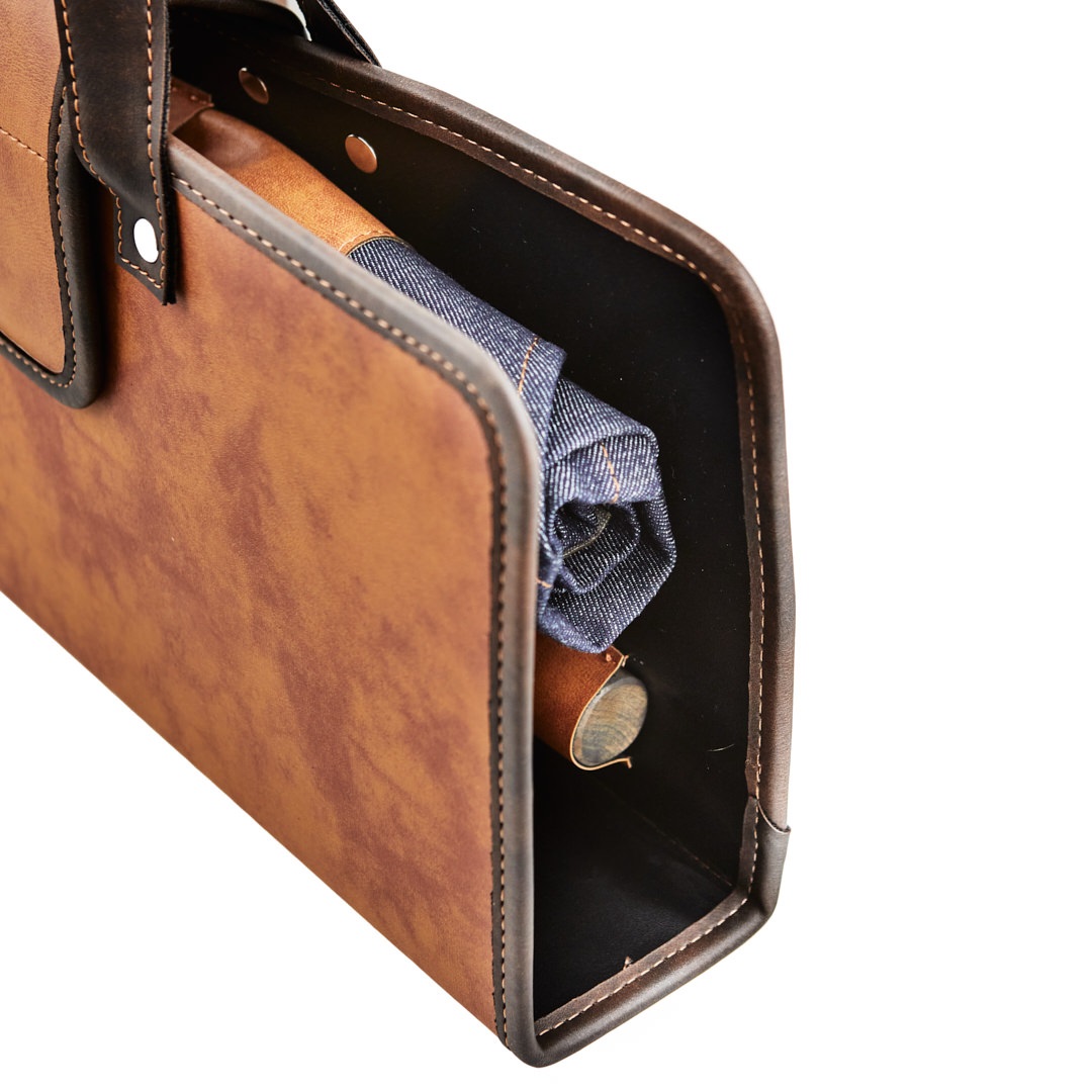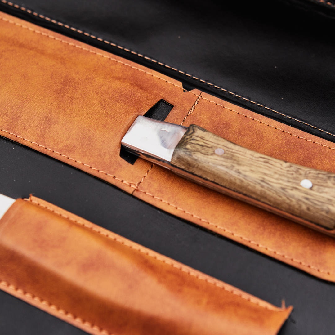 Estuche parrillero. Delantal “Alma de chef”. Chaira artesanal. Cuchillo artesanal. Tenedor artesanal. Incluye aplicación de logo.