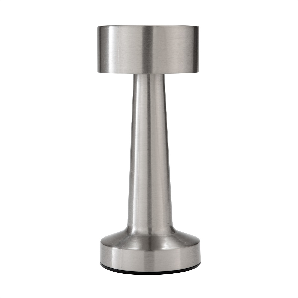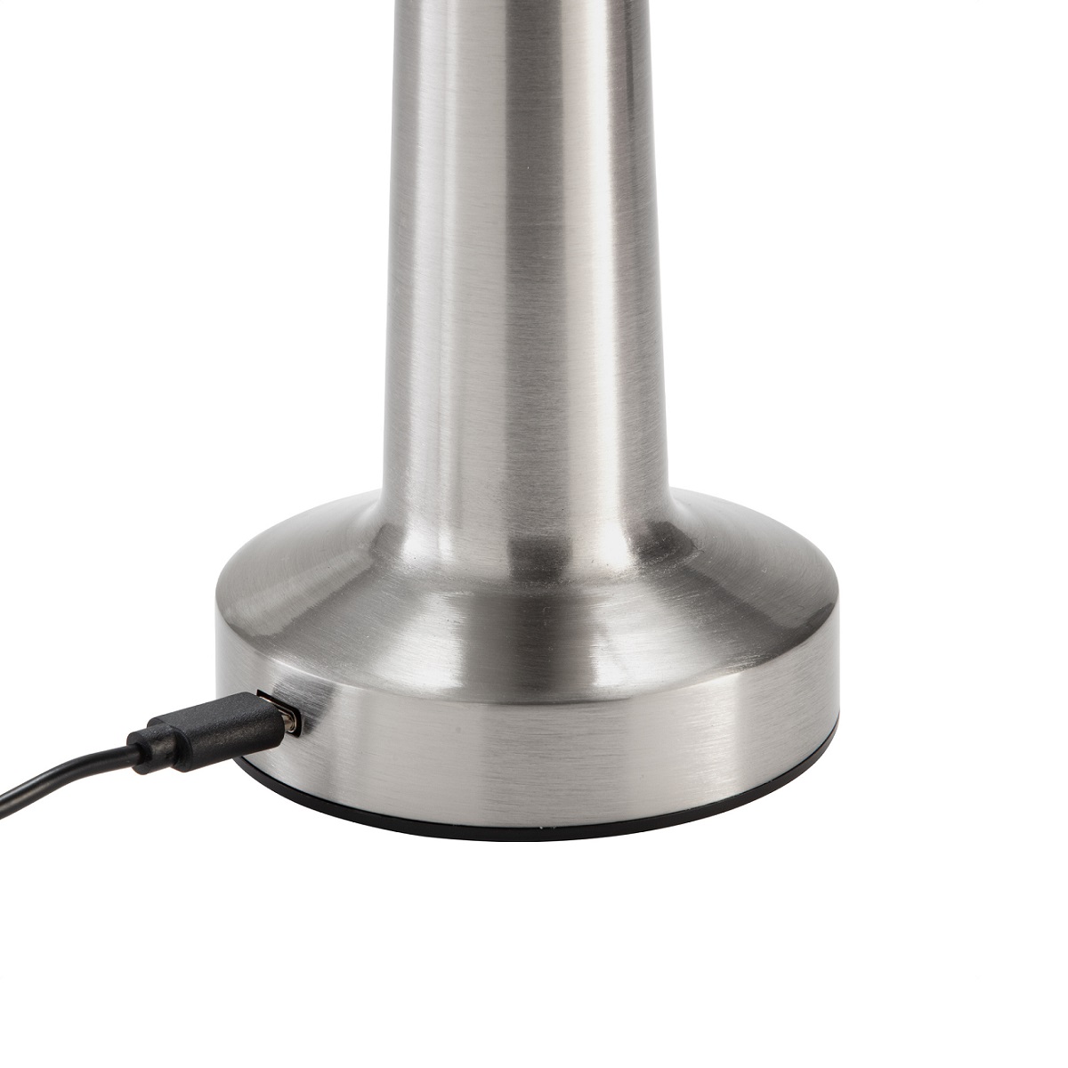 Lámpara de luz LED. Botón táctil de encendido/apagado que regula la intensidad y cambia tres modos de luz (cálida, blanca y blanca cálida). Batería de litio recargable de 800mAh. Tiempo de carga: 2-3 horas. Conexión USB-C. Incluye cable de carga color negro. Medidas: Ø9,5×21,5cm. Materiales: ABS, hierro y polipropileno. Incluye aplicación de logo.