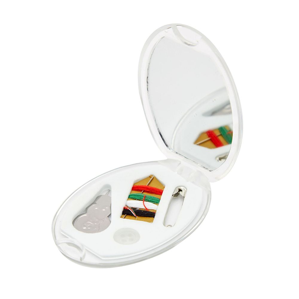 Mini costurero de viaje de plástico Incluye: Espejo, aguja con 4 tonos de hilo, botón y alfiler de gancho.