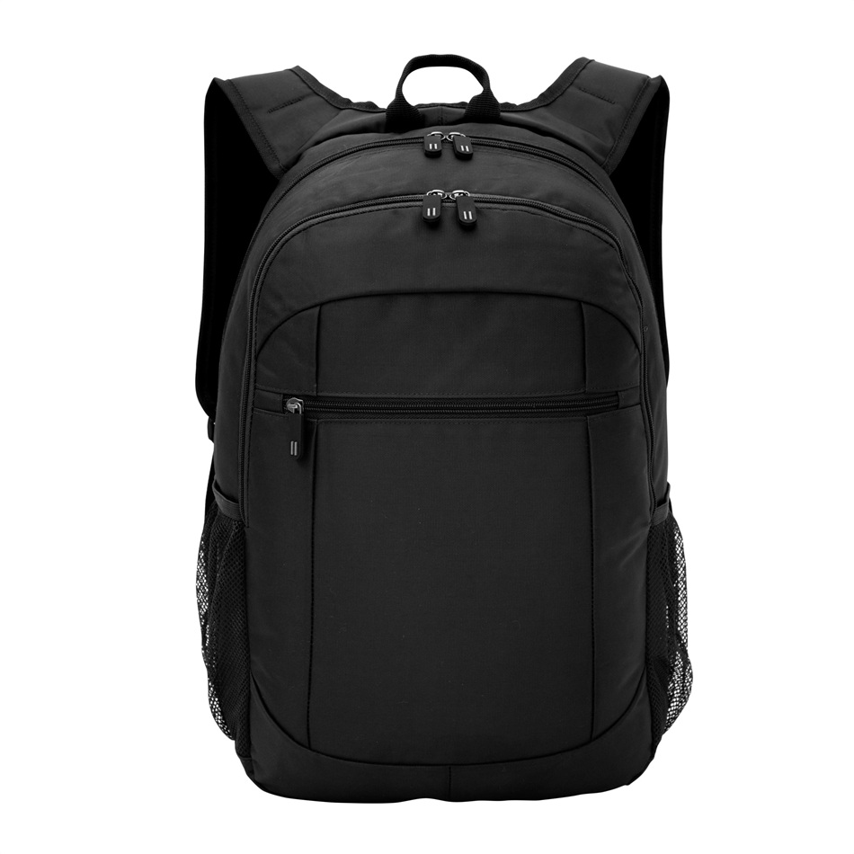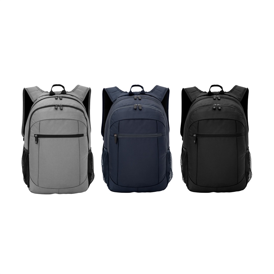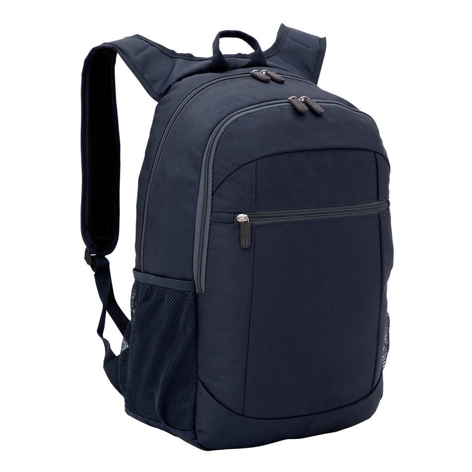 Mochila portanotebook de hasta 16 pulgadas. 2 compartimentos con doble cierre. Amplio compartimento principal posterior con bolsillos acolchados portanotebook y portatablet. Compartimento frontal, interior con bolsillos organizadores y 1 bolsillo frontal con cierre horizontal. 2 Bolsillos laterales de red elastizados porta botellas y accesorios. Asa superior, correas ajustables reforzadas y acolchadas, unidas en su parte superior para mayor resistencia, protección y comodidad. Espalda acolchada. Cierres metálicos con deslizadores de goma con detalles de color. Medidas: 46x30x16,5cm. Capacidad: 22 litros aprox. Incluye aplicación de logo.