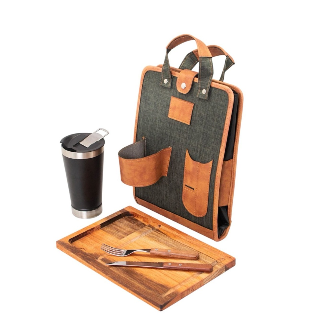 Estuche cordura melange verde militar con eco cuero caramelo. Vaso de acero termico de cerveza con tapa y destapador 473ml. Juego de cubiertos tramontina dynamic. Plato calado 30,5x21cm. Bolsa silver para platos. Incluye aplicación de logo.