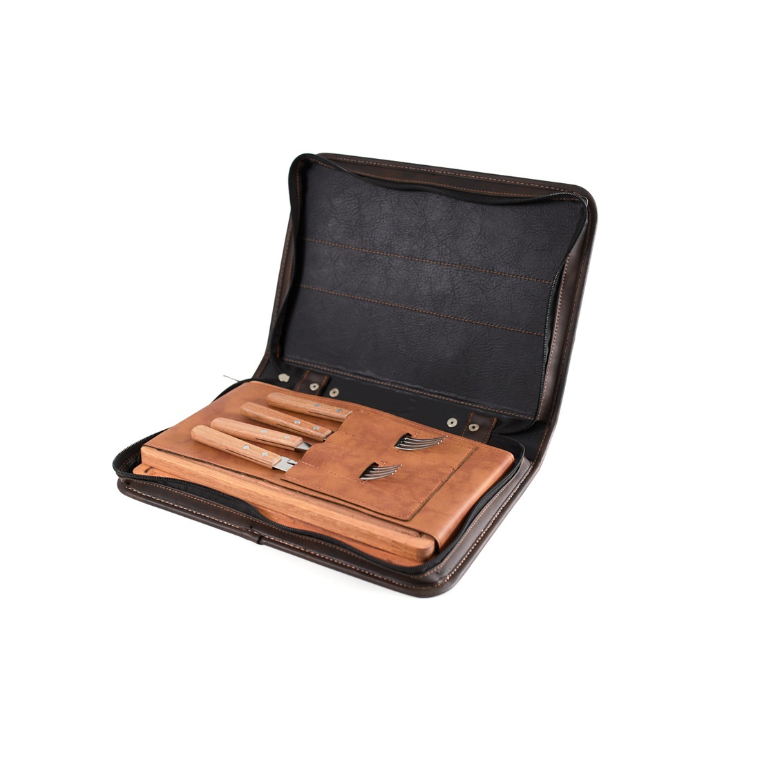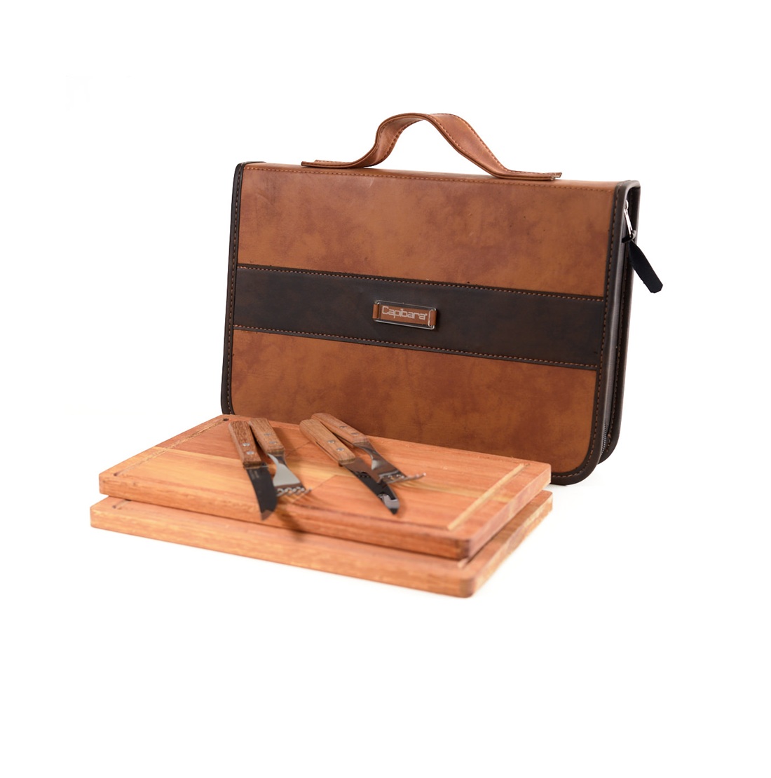 Estuche rectangular con cierre de ecocuero tricapa (23x33x5cm). 2 Platos rectangulares de madera de Leuka con canal para goteo (29x17x1,5). 2 Juegos de cubiertos acero inoxidable con mango de madera Tramontina Dynamic. Incluye aplicación de logo.