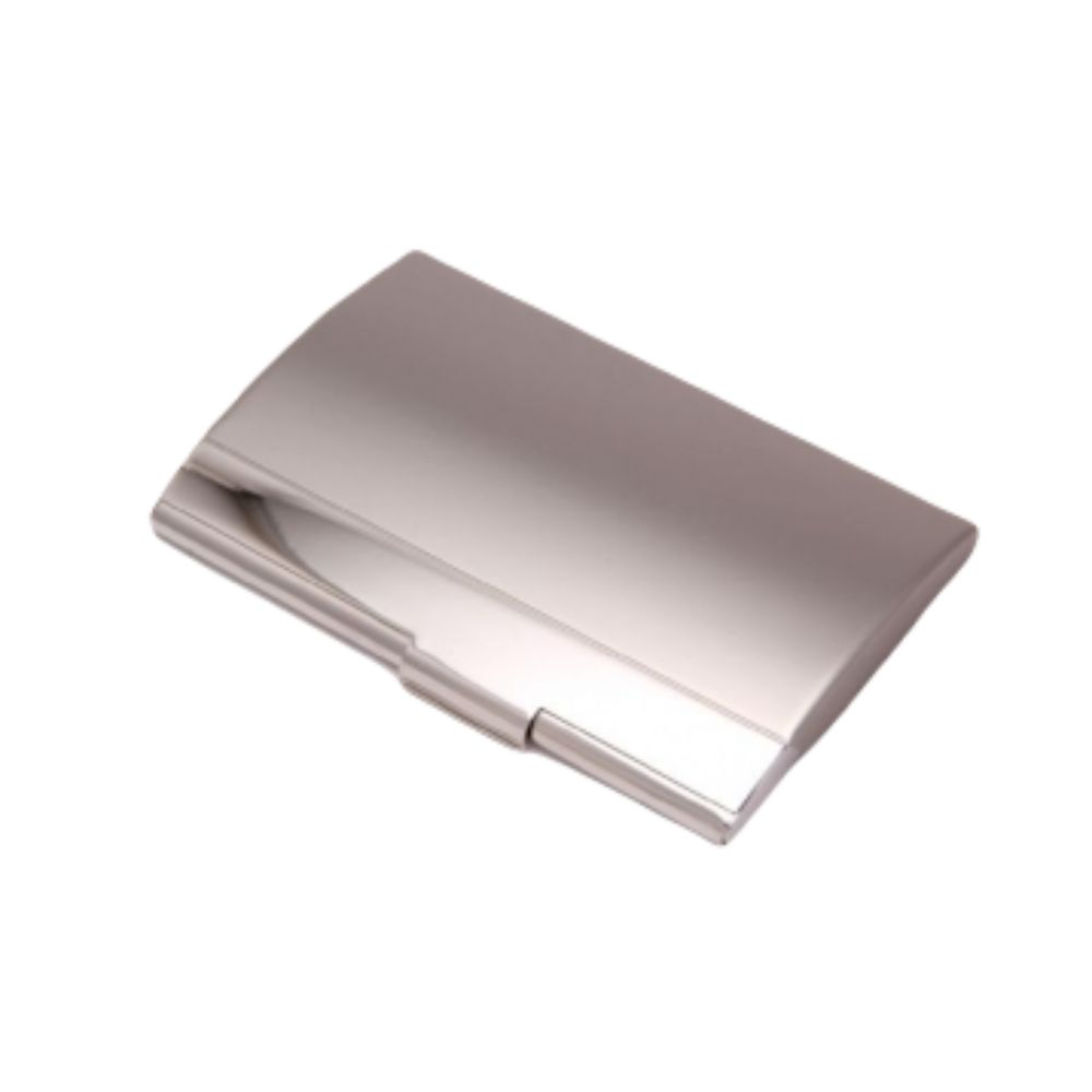 Tarjetero metálico con forma Bombé con franja. Apertura horizontal. Medidas : 9,5 x 6cm. Dimensiones: para tarjetas de 95 mm y 60 mm. Capacidad: 20 tarjetas personales. Incluye aplicacion de logo.